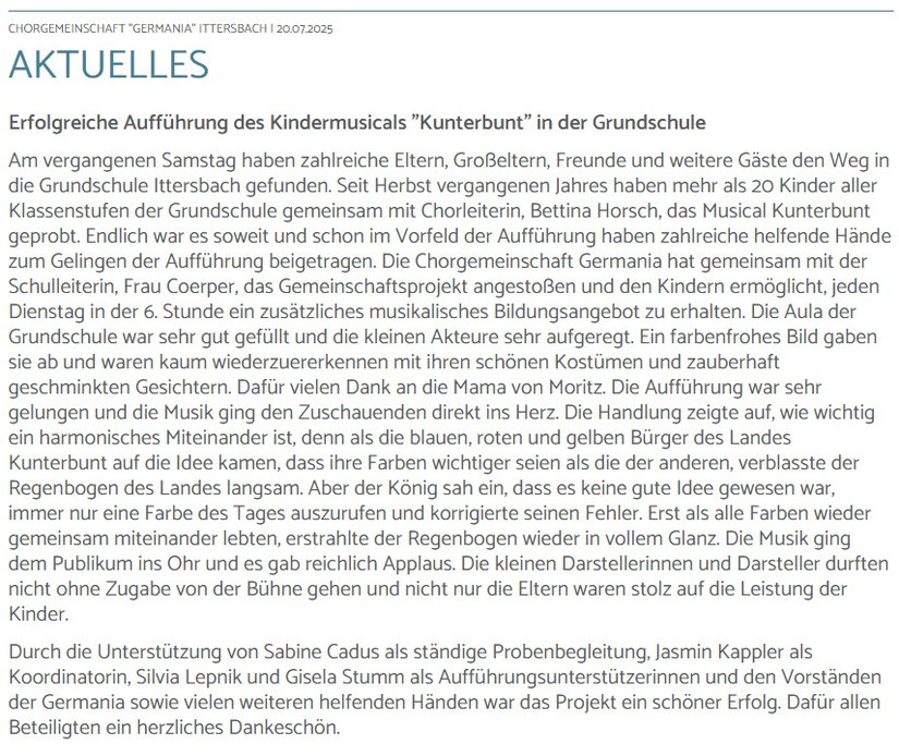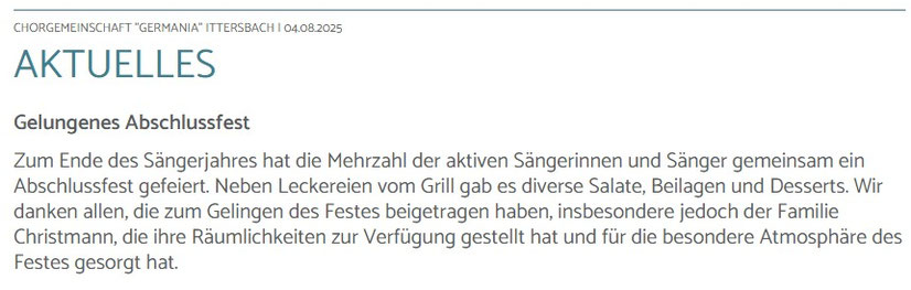 Die Chorgemeinschaft „Germania“ Ittersbach trauert um ihr langjähriges Mitglied Dietlinde (Didi) Bader-Glöckner, die am 14. Mai verstorben ist. Didi zählte zu den Sing & Swing Akteuren der ersten Stunden und trat 1993 der „Germania“ bei. Der Verein lag ihr immer sehr am Herzen und so hat sie sich auch in vielfältiger Form in diese Gemeinschaft eingebracht. Mit ihren professionell gestalteten Plakaten, Flyern, Banner und dem Jubiläumskalender zum 150. Vereinsjubiläum der „Germania“ hatte Sie großen Anteil an der Außenwirkung des Sing & Swing und des Vereins. Auch in der Vereinsorganisation übernahm Sie über viele Jahre Verantwortung in unterschiedlichen Funktionen, ob als Chorsprecherin, Schriftführerin, Beisitzerin oder auch als Kassenprüferin. Wir verlieren mit Didi eine Sängerin und Mitstreiterin, die sich stets engagierte und ihr kreatives Talent in den Dienst des Vereins stellte, solange es ihre Gesundheit zuließ. Unser tiefes Mitgefühl gilt ihrer Familie und allen Angehörigen.
